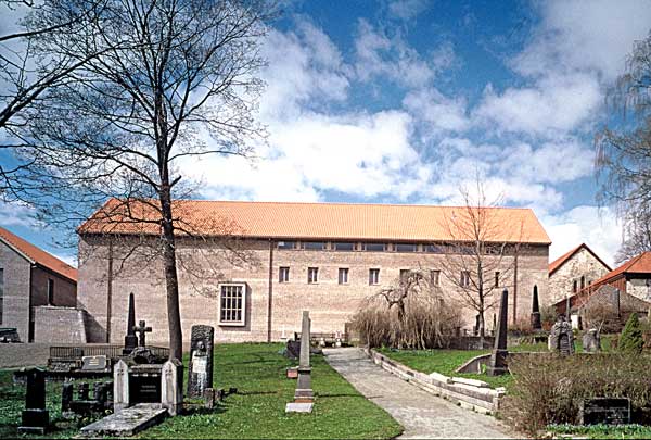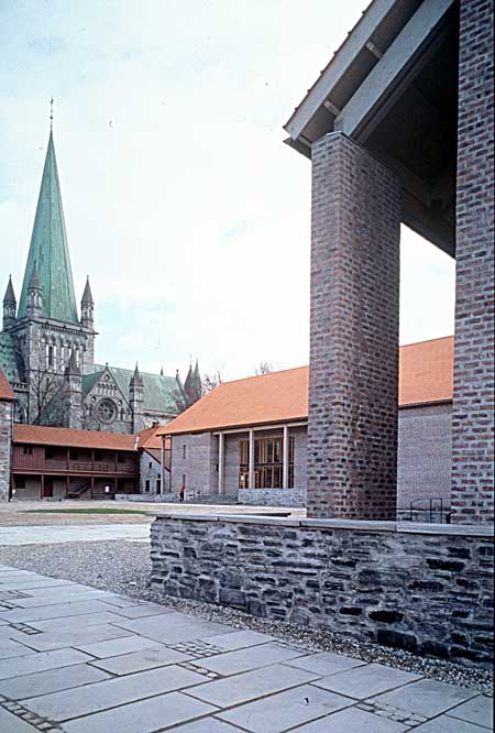 | Erkebispegårdens sør- og østfløy er blitt gjenoppbygget etter brannen i 1983, og sto ferdig til Trondheims 1000-årsjubileum i 1997, med nybygg tilpasset det eldre anlegget «i form, skala og tyngde, men fremstår samtidig som moderne elementer med et formspråk som tilfører omgivelsene nye kvaliteter» (fra arkitektens egen beskrivelse). Slik opplevde også Jan Carlsen denne respektfulle og samtidig djerve restaurering, en innsats som ble beæret med prisen Årets museum i 1998 og den nasjonale Murverksprisen i 1999. |