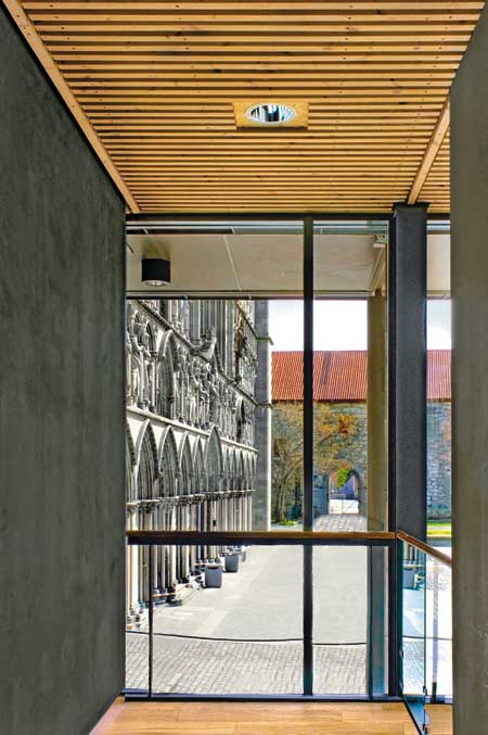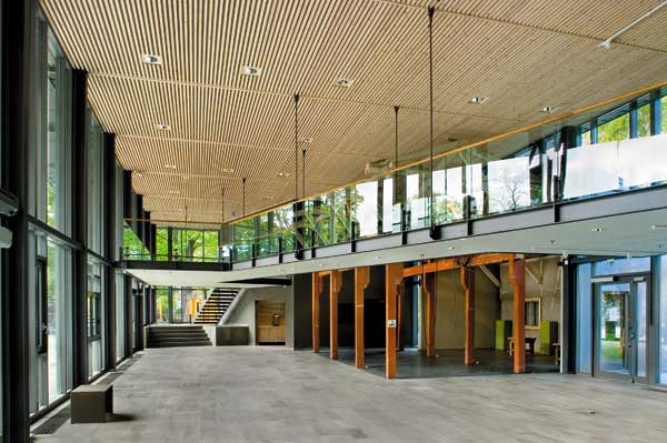 Besøkssenterets foajé har en romhøyde på seks meter og er utformet med åpne glassfasader både mot Vestfrontplassen og mot parken i nord.