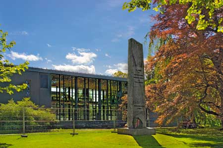 Besøkssenteret sett fra parken mot Bispegata i nord. Bautaen er reist: «Til minde om Eidsvoldsmandene Abdreas Rogert og Peter Schmidt av Trondhjems by».