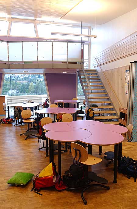 Fra undervisningspaviljong for mellom- og ungdomstrinnet. Paviljongen kan brukes under ett eller underdelt ved hjelp av foldevegger. Her fra grupperom med hems.