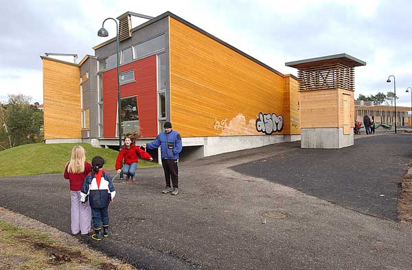 Selv den fineste fasade slipper ikke unna tagging, dessverre! Det lille tårnet er et luftinntak for skolens ventilasjonsanlegg.